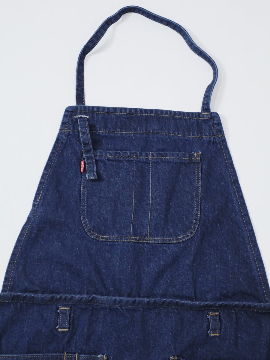 ミリタリーデニムの多機能デニムエプロン。前掛けタイプと腰巻きタイプの2通りの着かたが楽しめます。